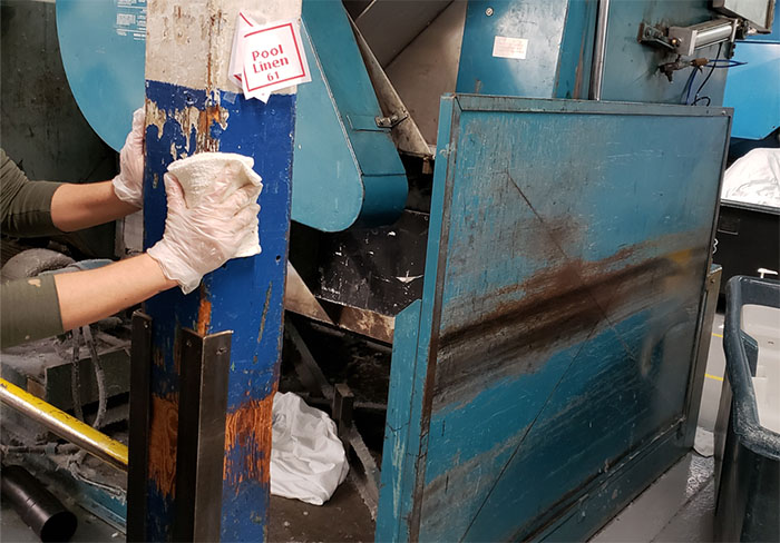 Images capturing our cleaning and disinfecting experts hard at work sanitizing a laundry processing plant.